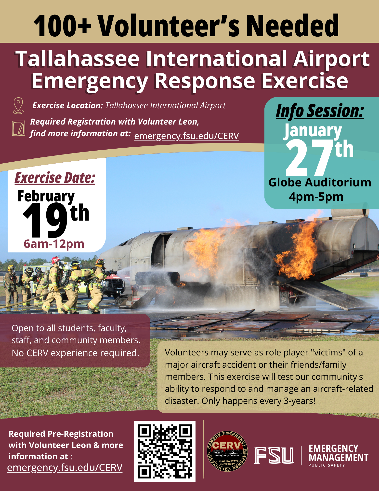 Volunteers are needed for the Tallahassee International Airport's 2026 Emergency Exercise. The exercise will take place on Thursday, February 19, 2026 from 6:00am to 12:00pm. Volunteers may serve as "victims" of a major aircraft accident or their friends/family members. This exercise will test our community's ability to respond to and manage an aircraft-related disaster. No CERV experience required.