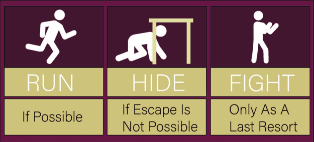 - If evacuation is not possible, find a secure hiding place.