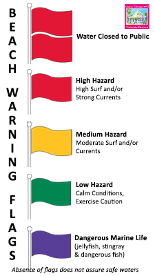 Read the beach safety signs at the entrance to the beach. Once on the beach, look for beach warning flags, often posted on or near a lifeguard’s stand. A green flag means water conditions are safe and other colors mean conditions are not safe. These flags are there to protect you. Please read and obey the posted beach signs and warning flags.